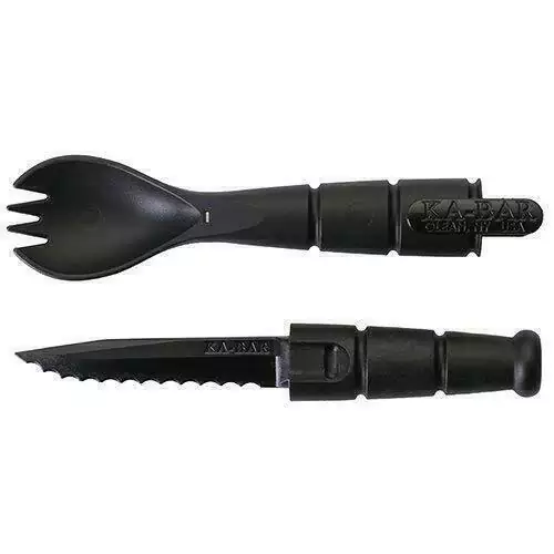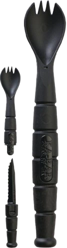 Descrição: O Conjunto de Talheres Field Kit Spork é perfeito para acampamentos, caminhadas, piqueniques, armazenamento em luvas e mochilas, e para refeições em movimento. Feitos de Creamid, material seguro para alimentos e água, os Sporks são seguros para máquina de lavar louça. Eles apresentam uma combinação de colher/garfo na base e uma faca serrilhada internamente. A faca é acessada puxando nas extremidades do Spork. O comprimento total de cada Spork é de 6,875 polegadas, com comprimento da lâmina da faca de 2,5 polegadas.